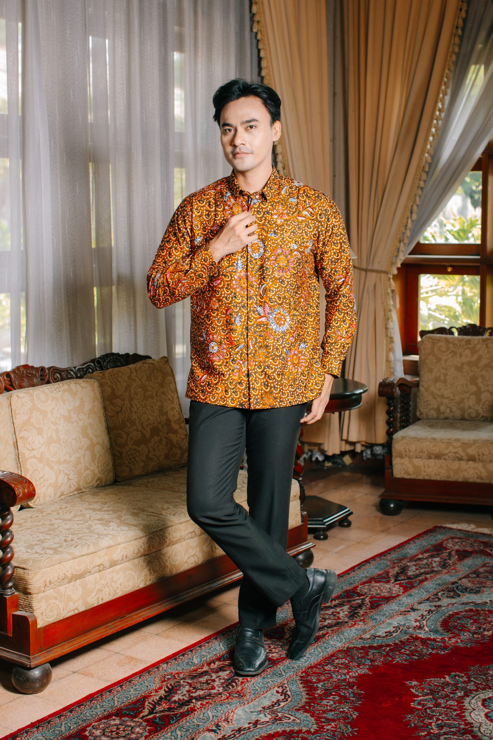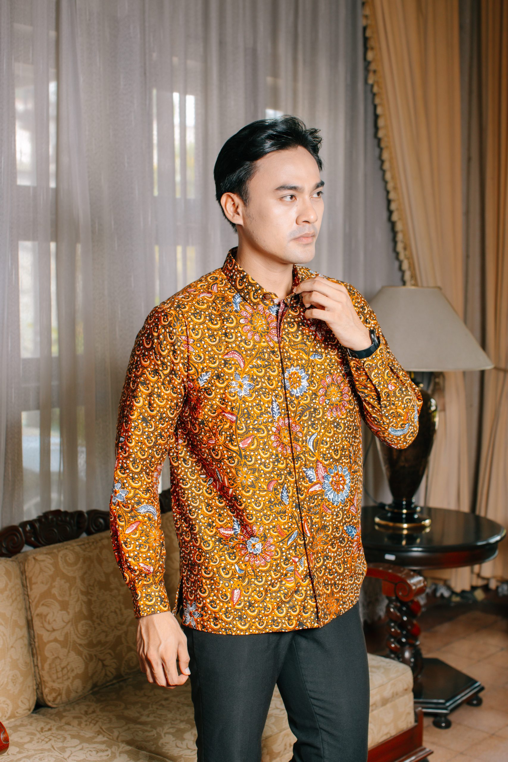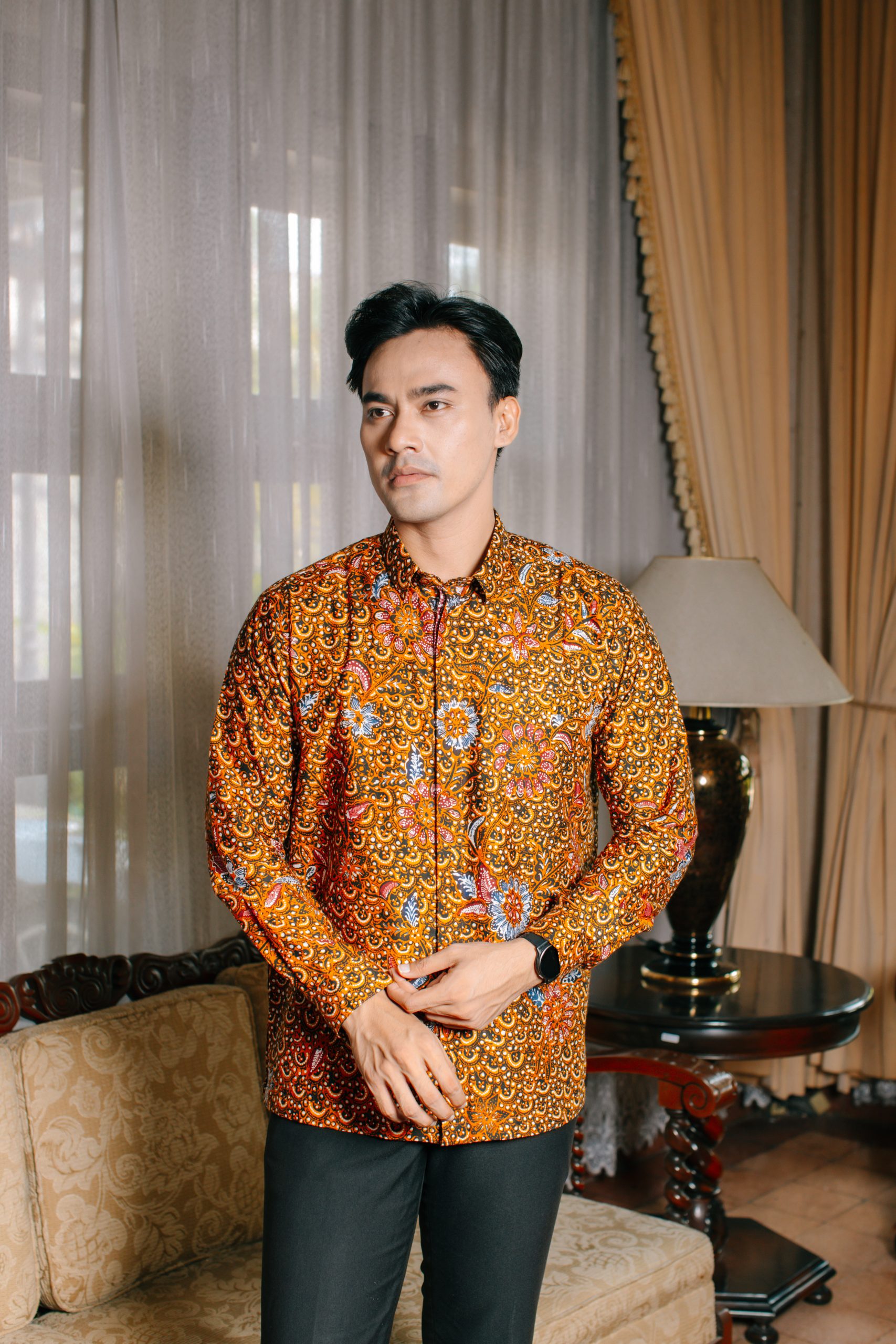 Hem Pria Puspita 2094: adalah pilihan tepat bagi pria modern yang ingin tampil percaya diri dengan sentuhan warisan budaya Indonesia. Mengusung motif floral klasik bernuansa hangat dengan dominasi warna cokelat keemasan dan sentuhan merah yang artistik, kemeja batik lengan panjang ini menghadirkan kesan maskulin, berwibawa, dan timeless. Padukan dengan celana bahan hitam atau cokelat gelap untuk tampilan formal yang sophisticated.