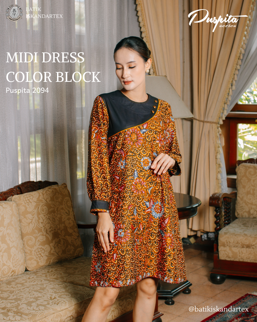 - Midi Dress Batik Color Block (Puspita Series 2094): Tampil elegan dengan sentuhan etnik modern melalui Midi Dress Color Block Puspita 2094. Koleksi eksklusif dari Batik Iskandartex ini menggabungkan keanggunan motif batik tradisional dengan potongan color-block yang kontemporer, menciptakan siluet yang ramping dan modis bagi wanita aktif.