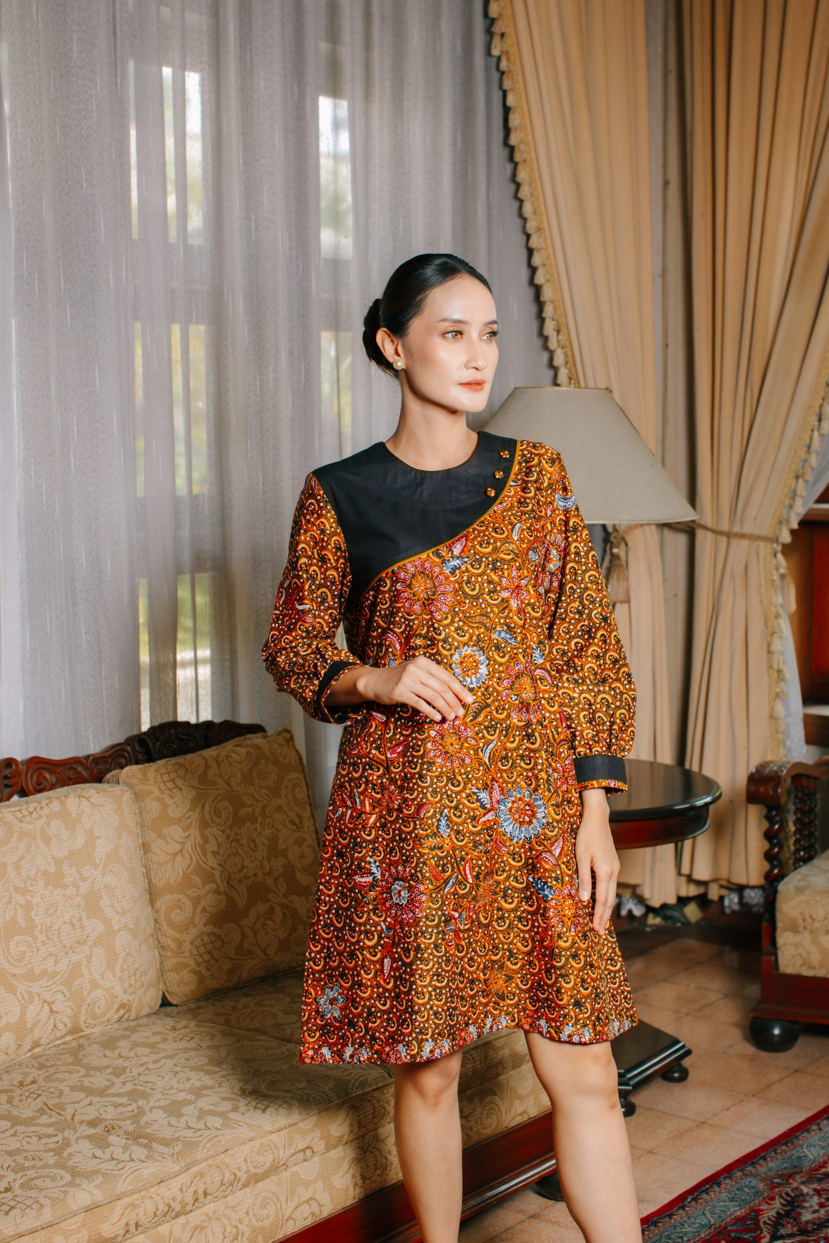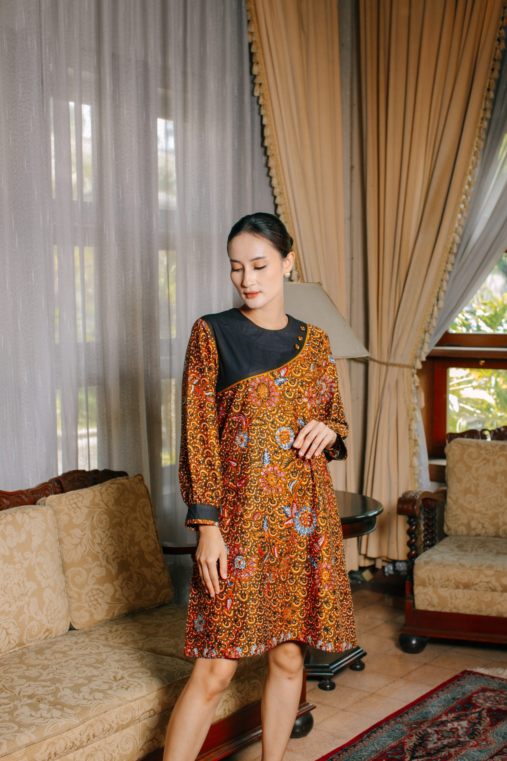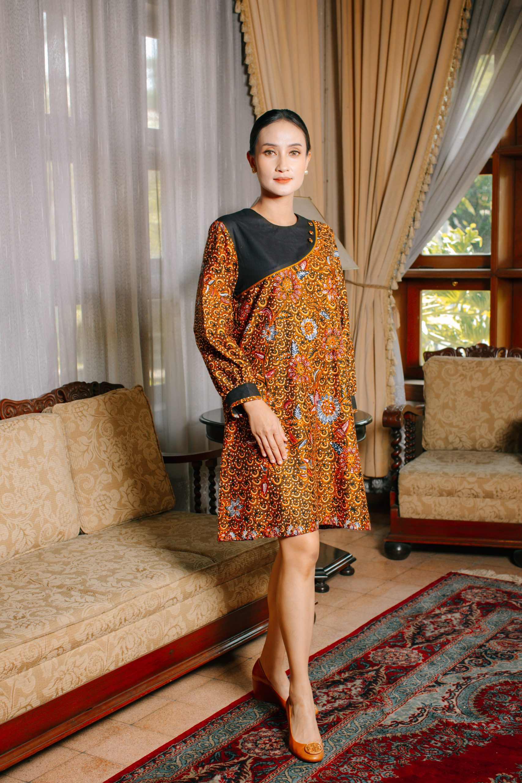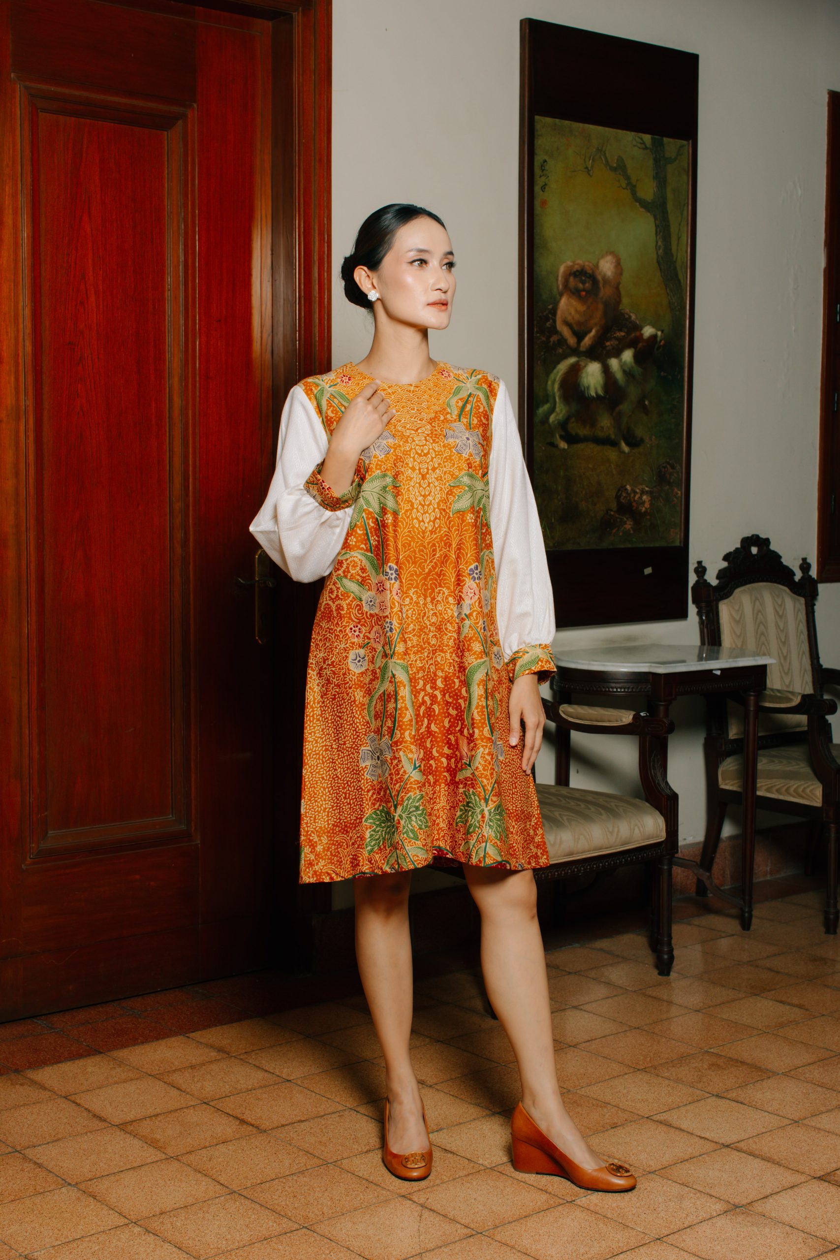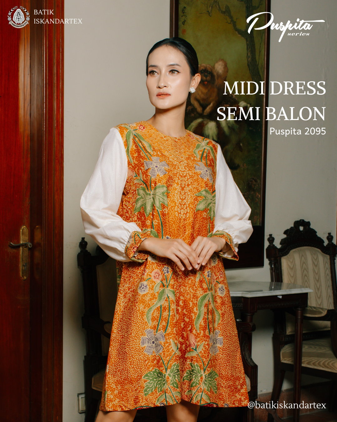 - Midi Dress Batik Semi Balon (Puspita 2095): Dress batik wanita ini dirancang dengan potongan midi serta model lengan semi balon yang memberikan siluet feminin, anggun, dan tetap nyaman digunakan sepanjang hari. Kombinasi motif floral khas batik Indonesia dengan warna oranye keemasan menciptakan tampilan yang fresh namun tetap sophisticated.
