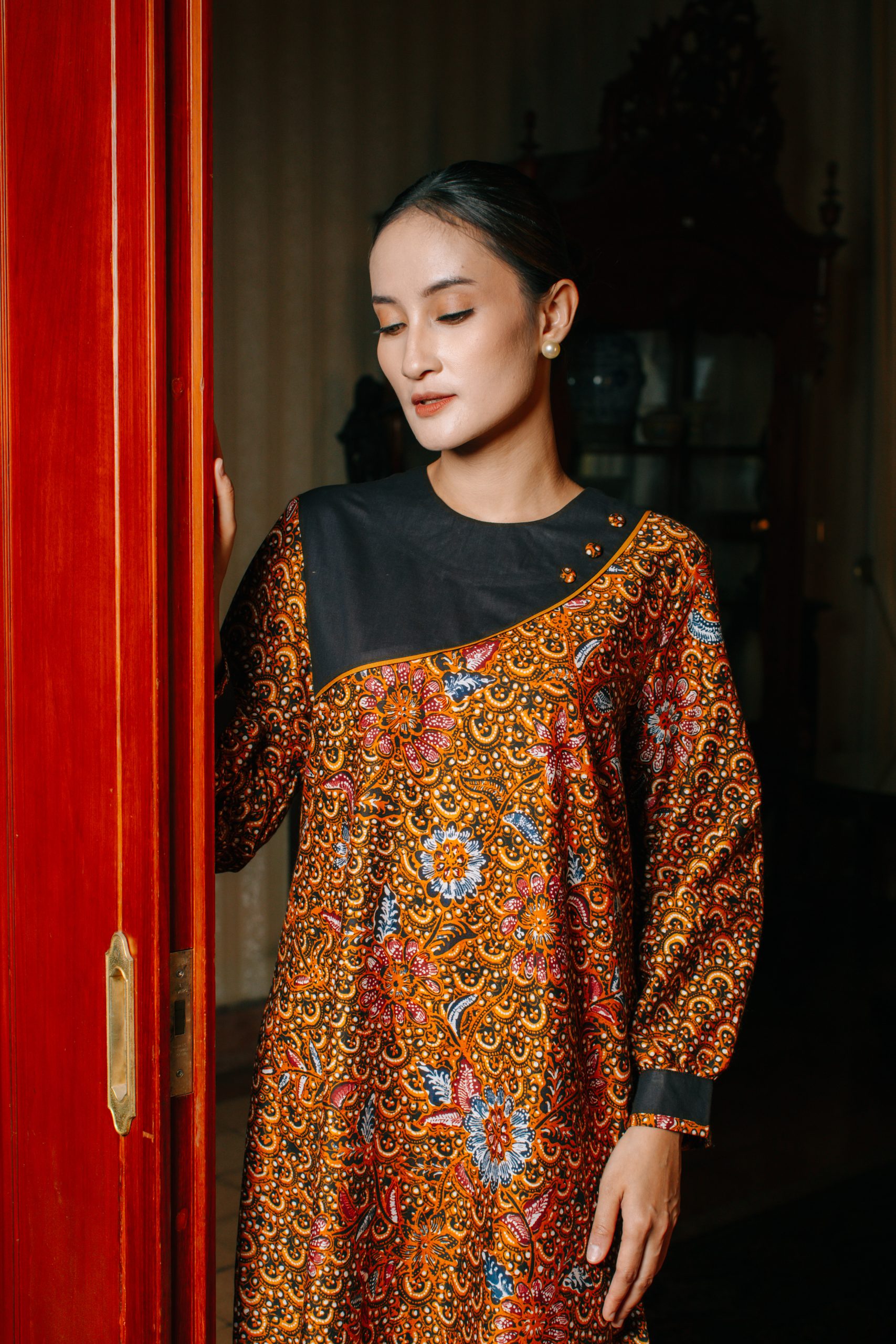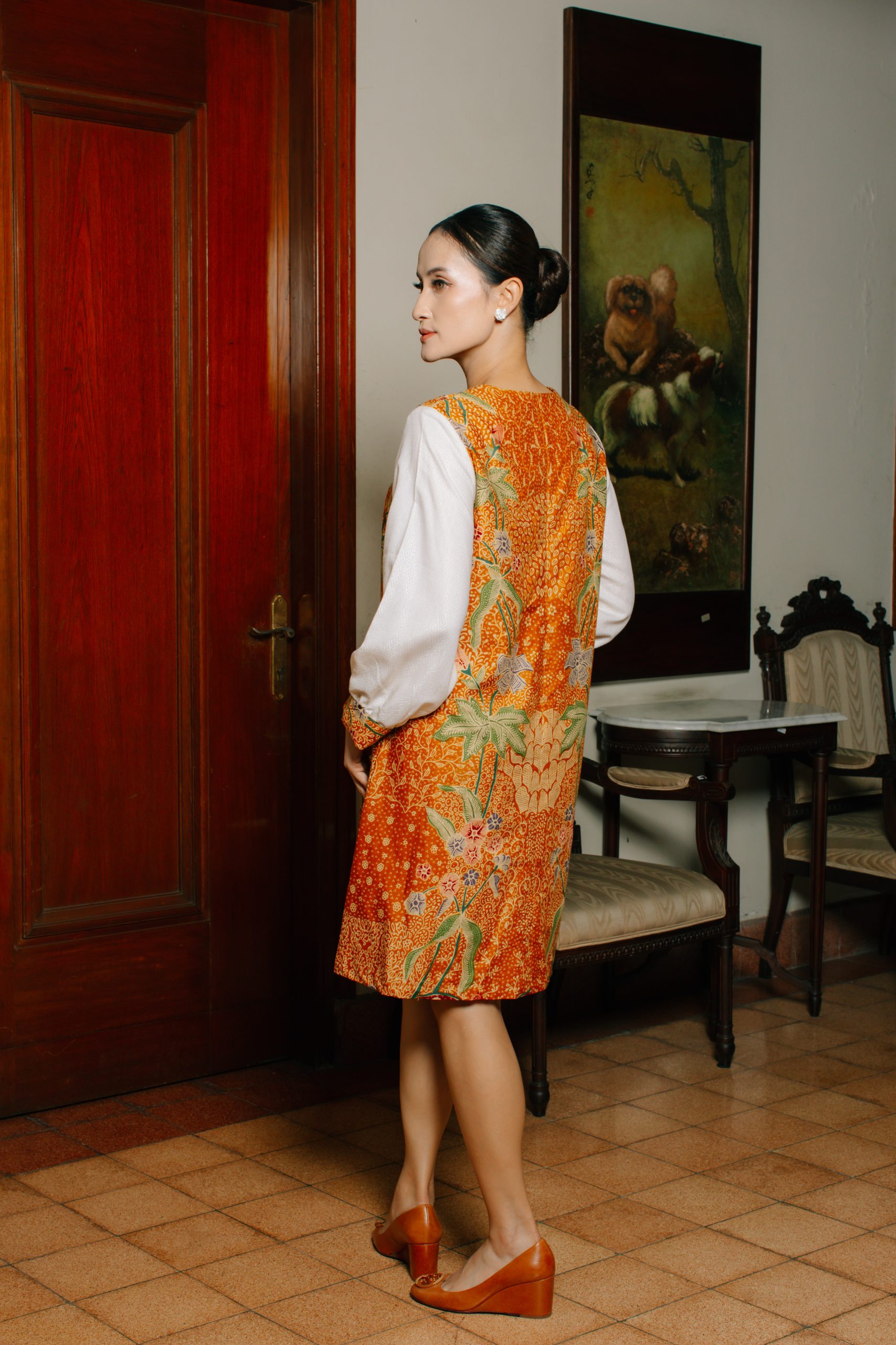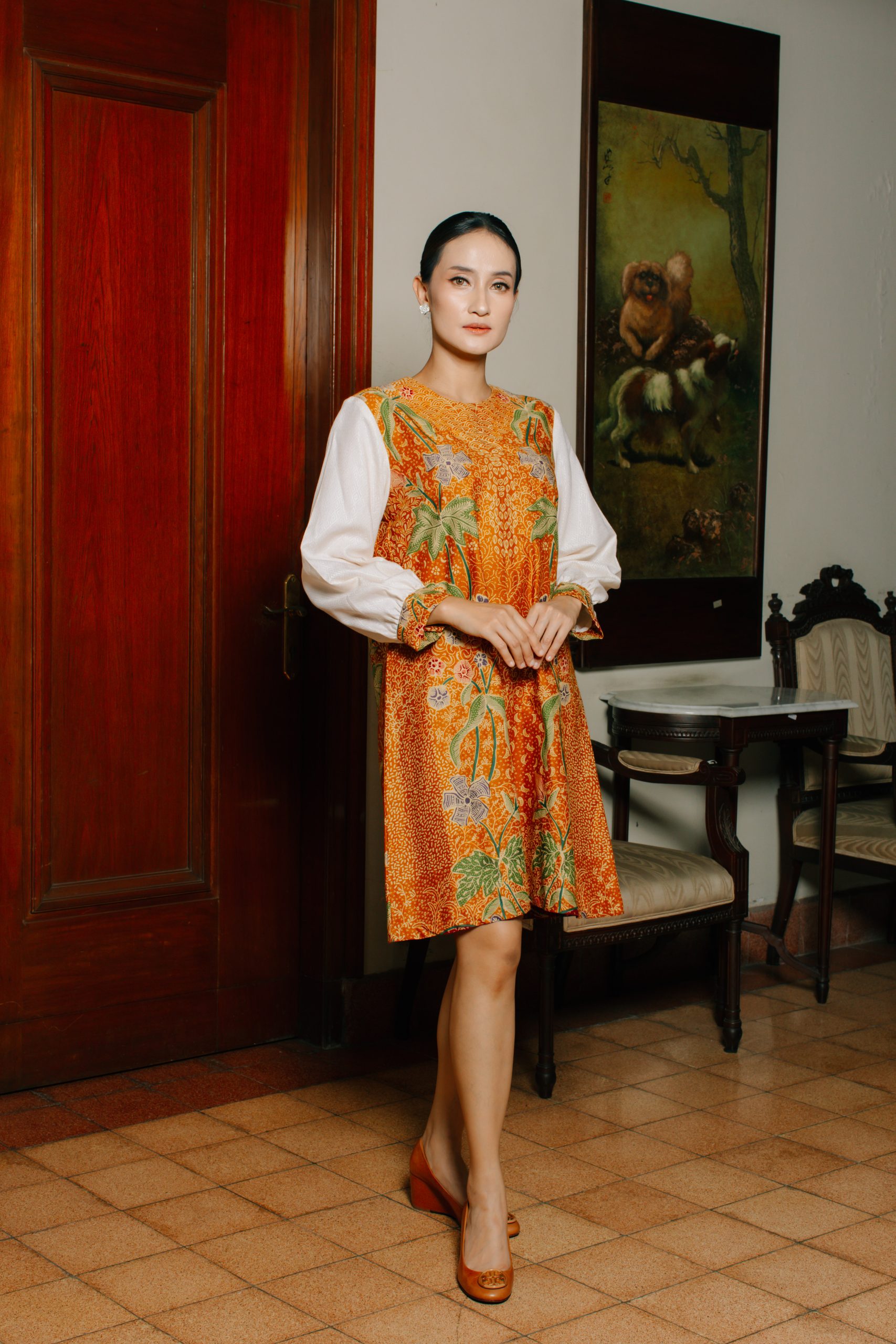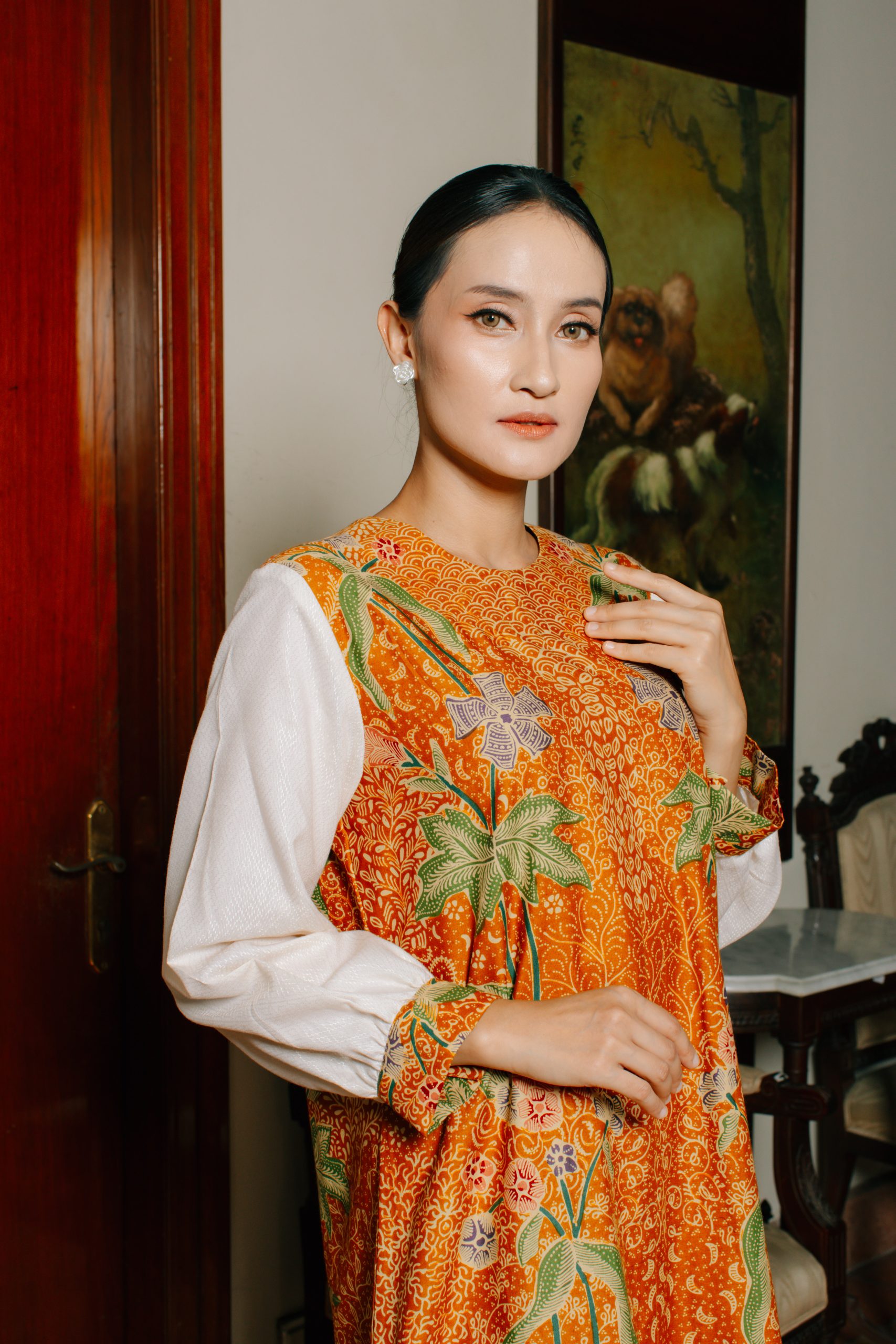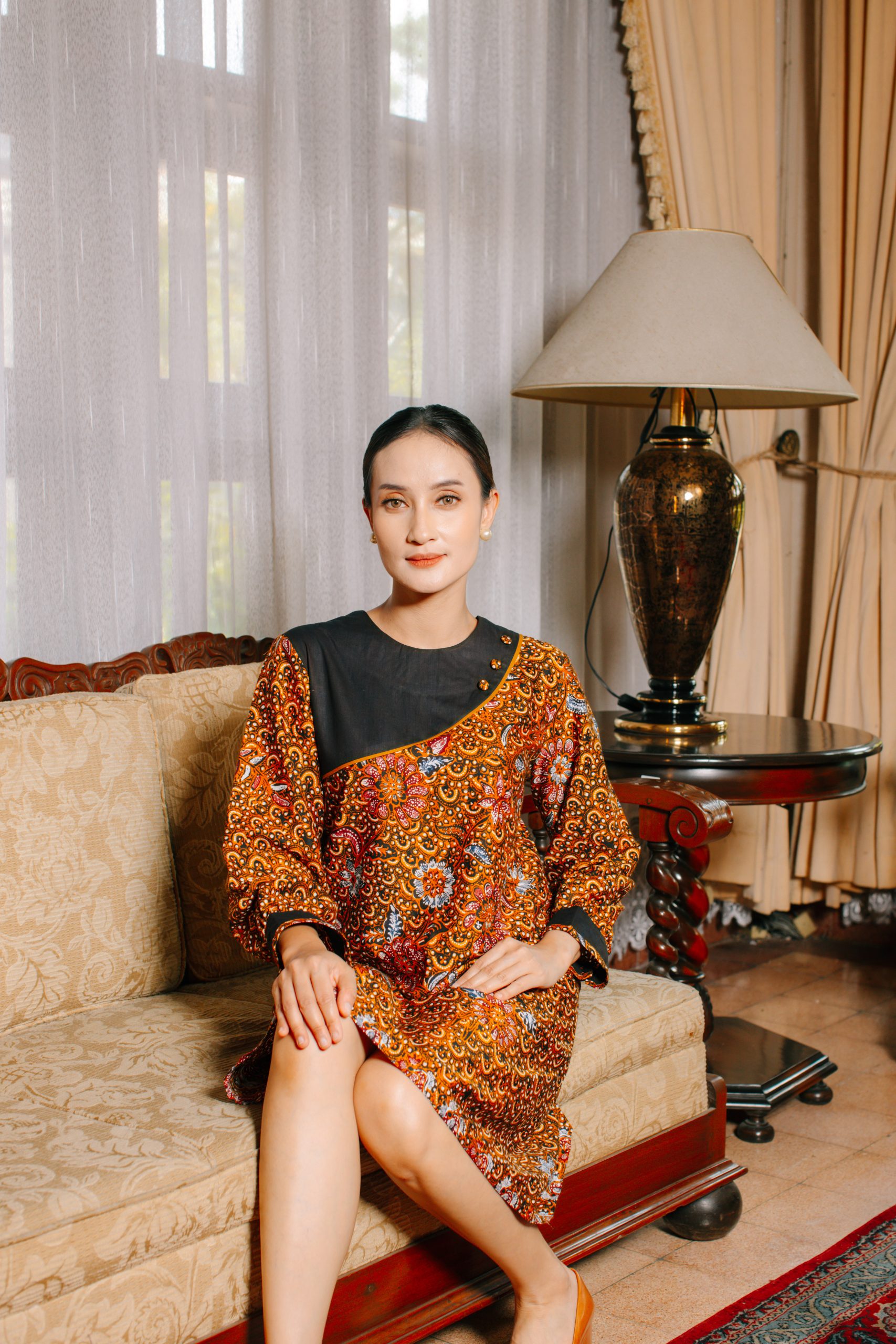 - Midi Dress Batik Semi Balon (Puspita 2095): Dress batik wanita ini dirancang dengan potongan midi serta model lengan semi balon yang memberikan siluet feminin, anggun, dan tetap nyaman digunakan sepanjang hari. Kombinasi motif floral khas batik Indonesia dengan warna oranye keemasan menciptakan tampilan yang fresh namun tetap sophisticated.