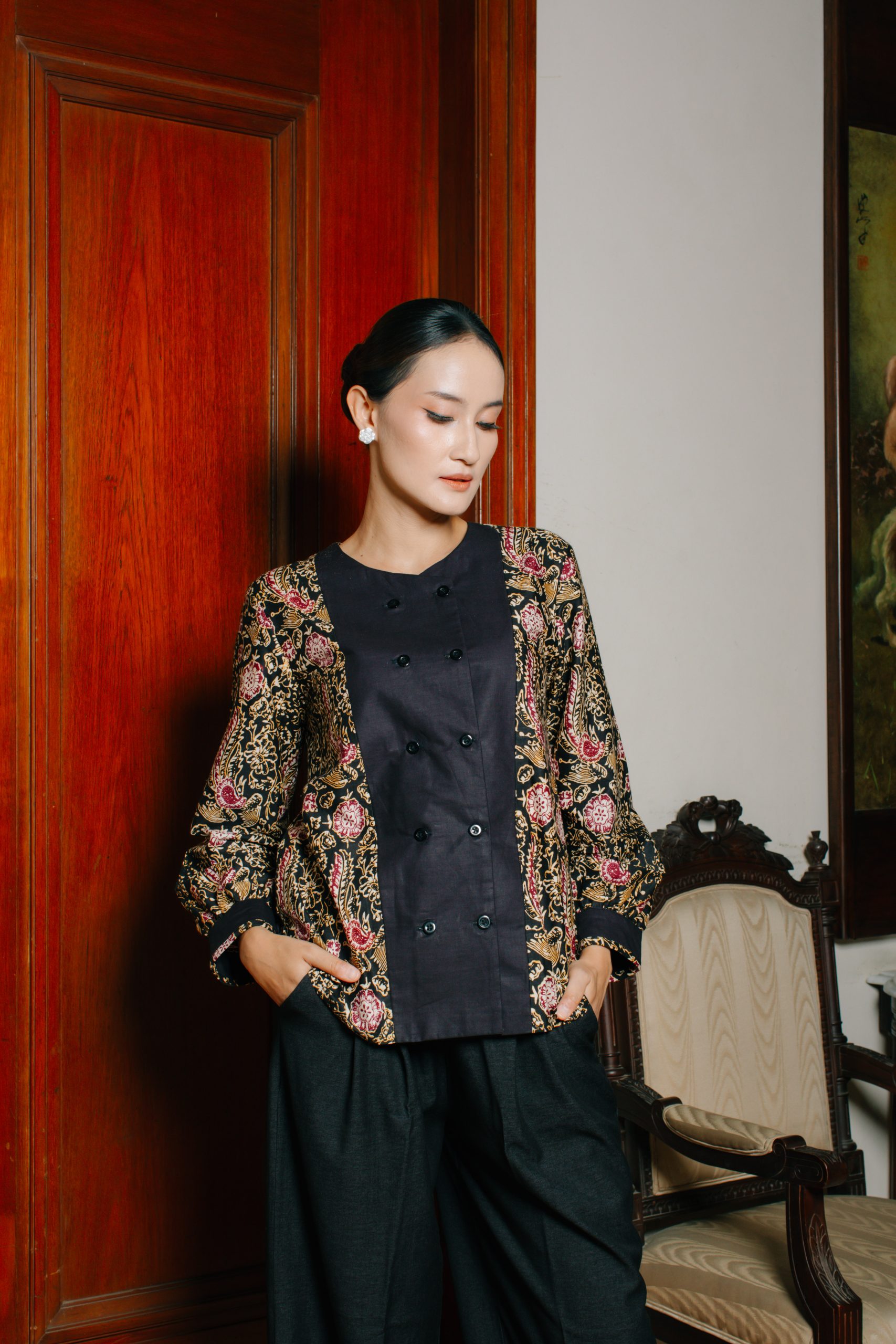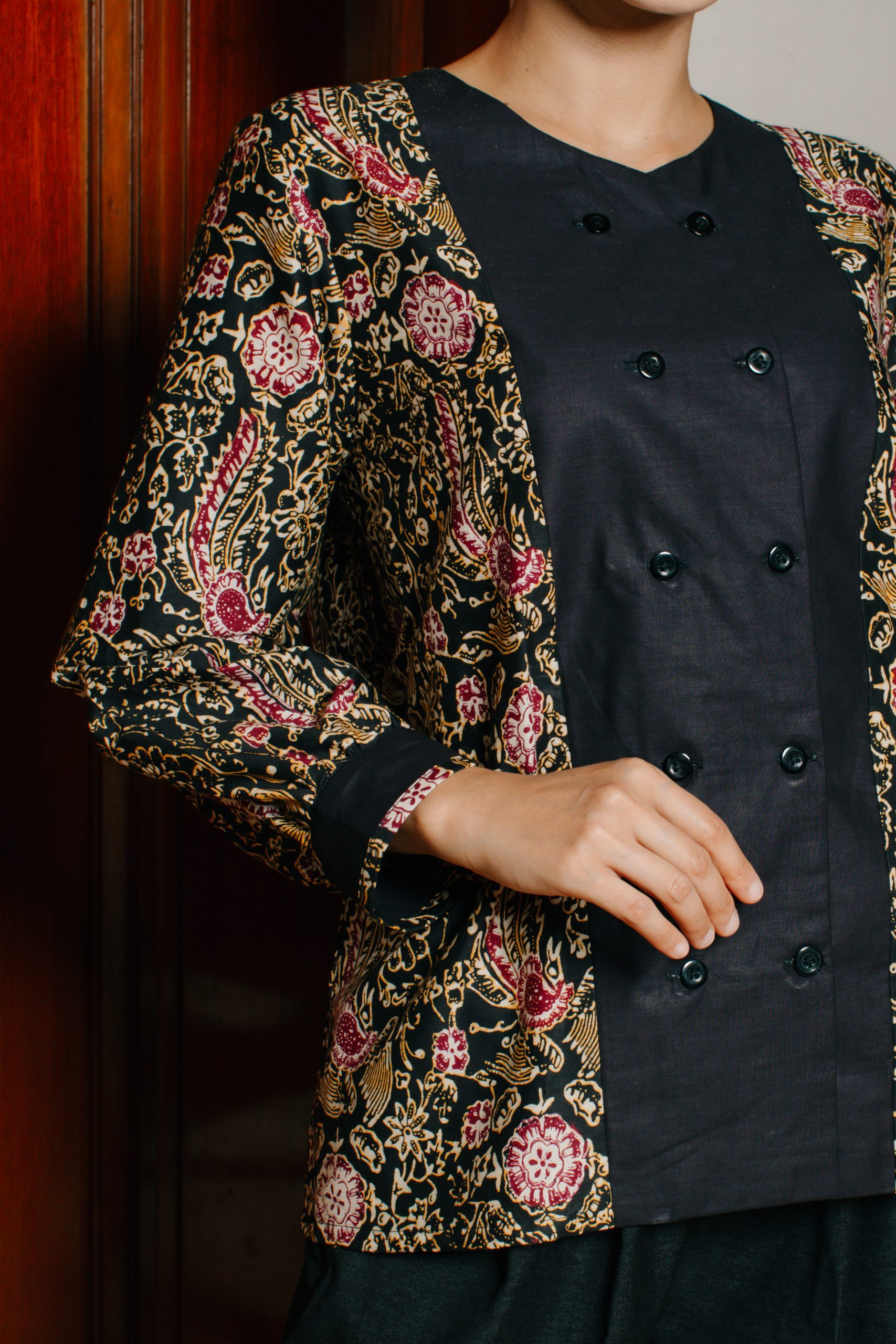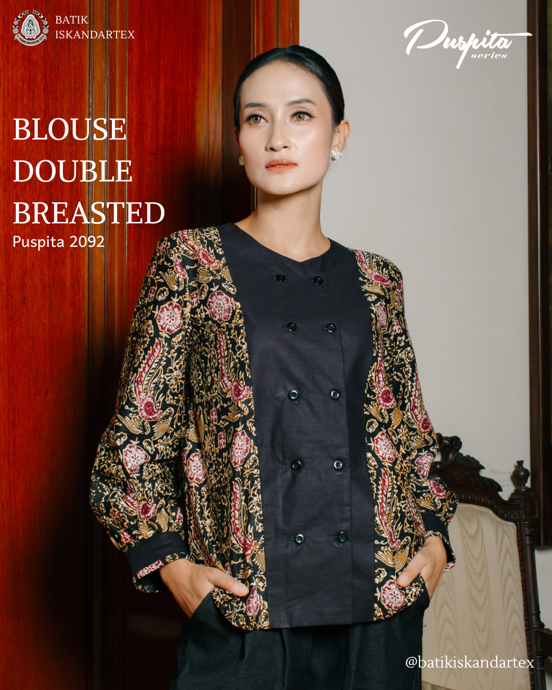 - Blouse Batik Double Breasted (Puspita 2092): Atasan batik wanita ini mengusung konsep double breasted dengan kombinasi warna hitam elegan dan motif floral klasik berkarakter. Desain ini memberikan kesan profesional, sophisticated, dan eksklusif sehingga cocok digunakan sebagai batik kerja wanita maupun outfit formal untuk acara resmi.