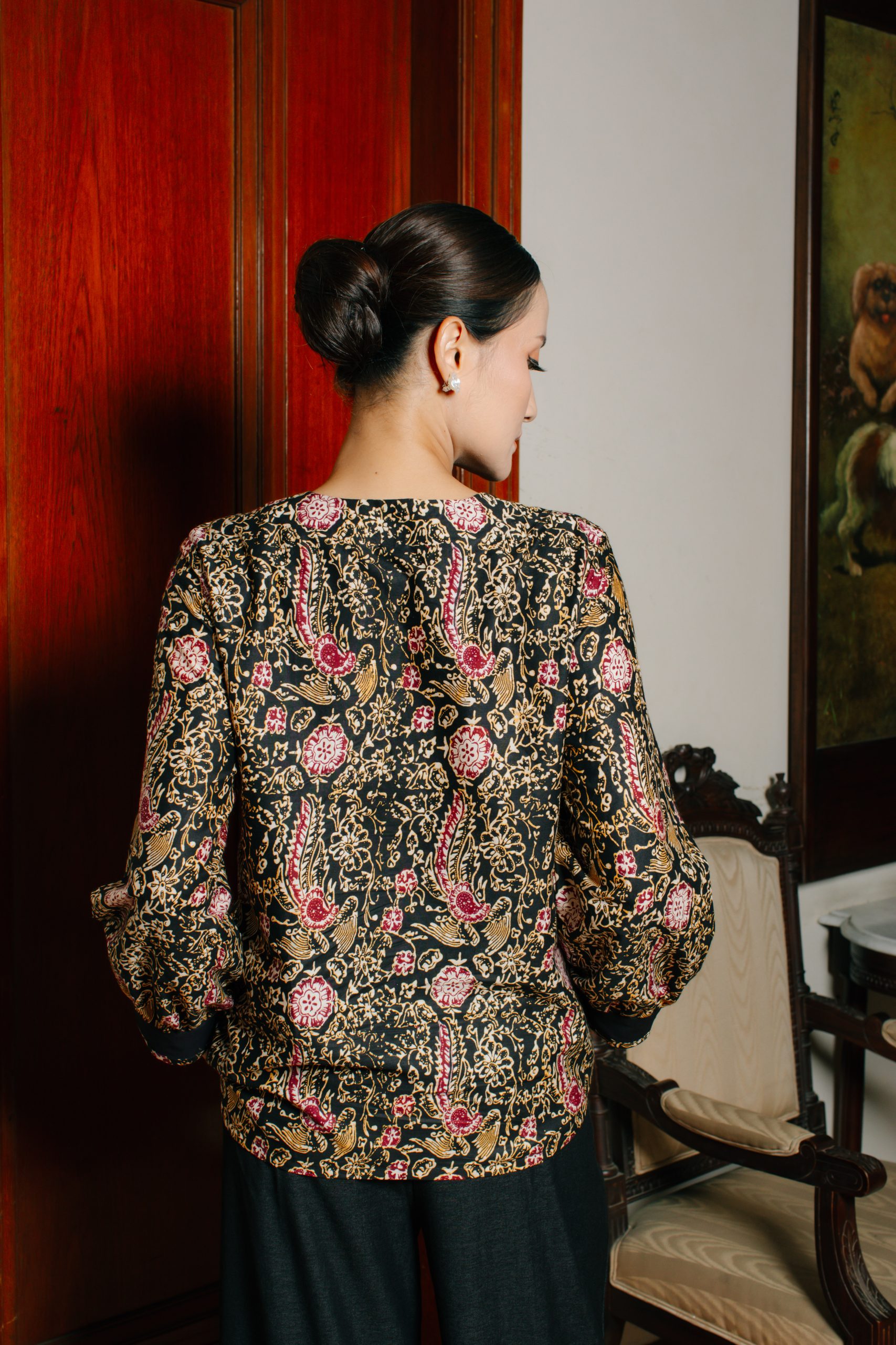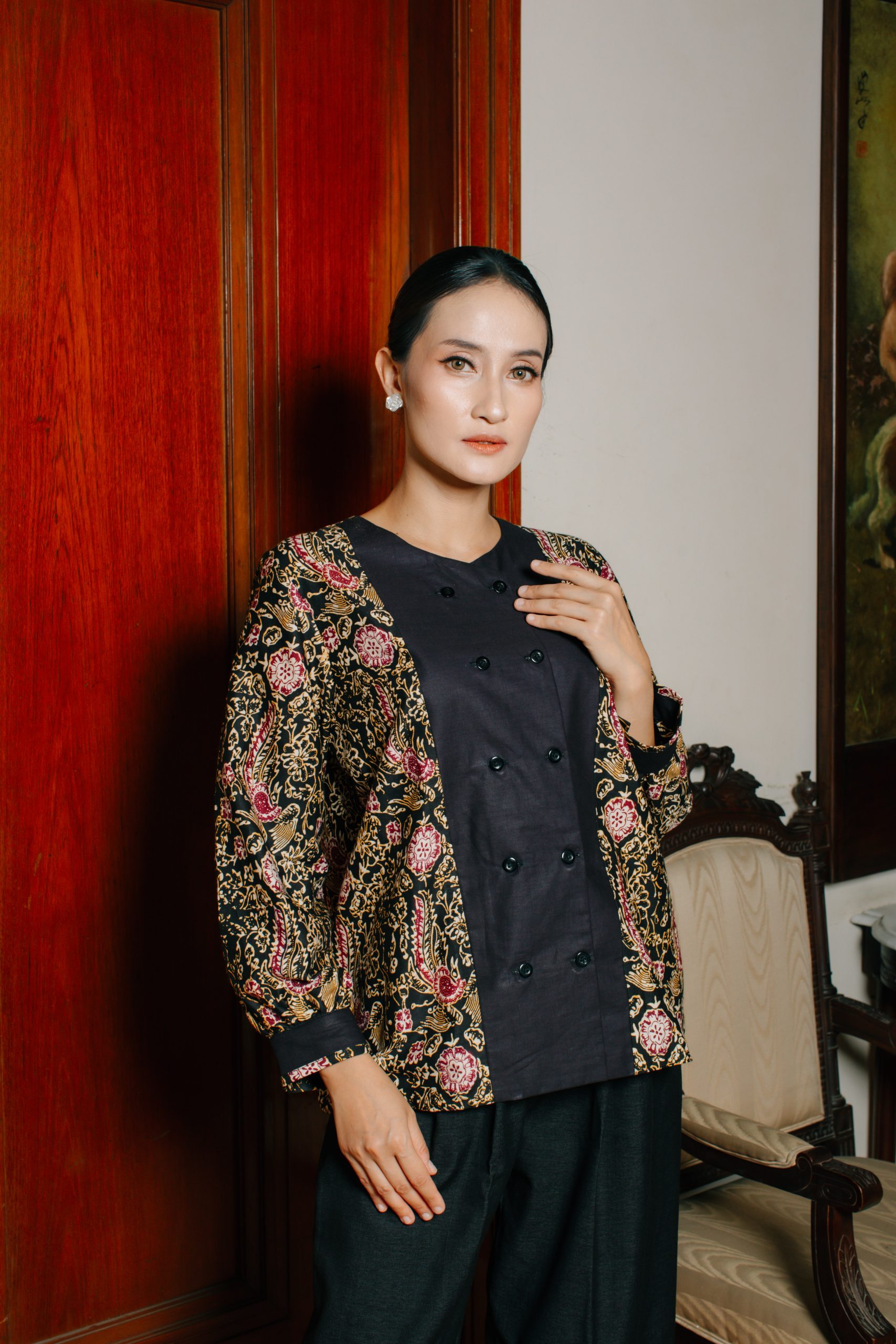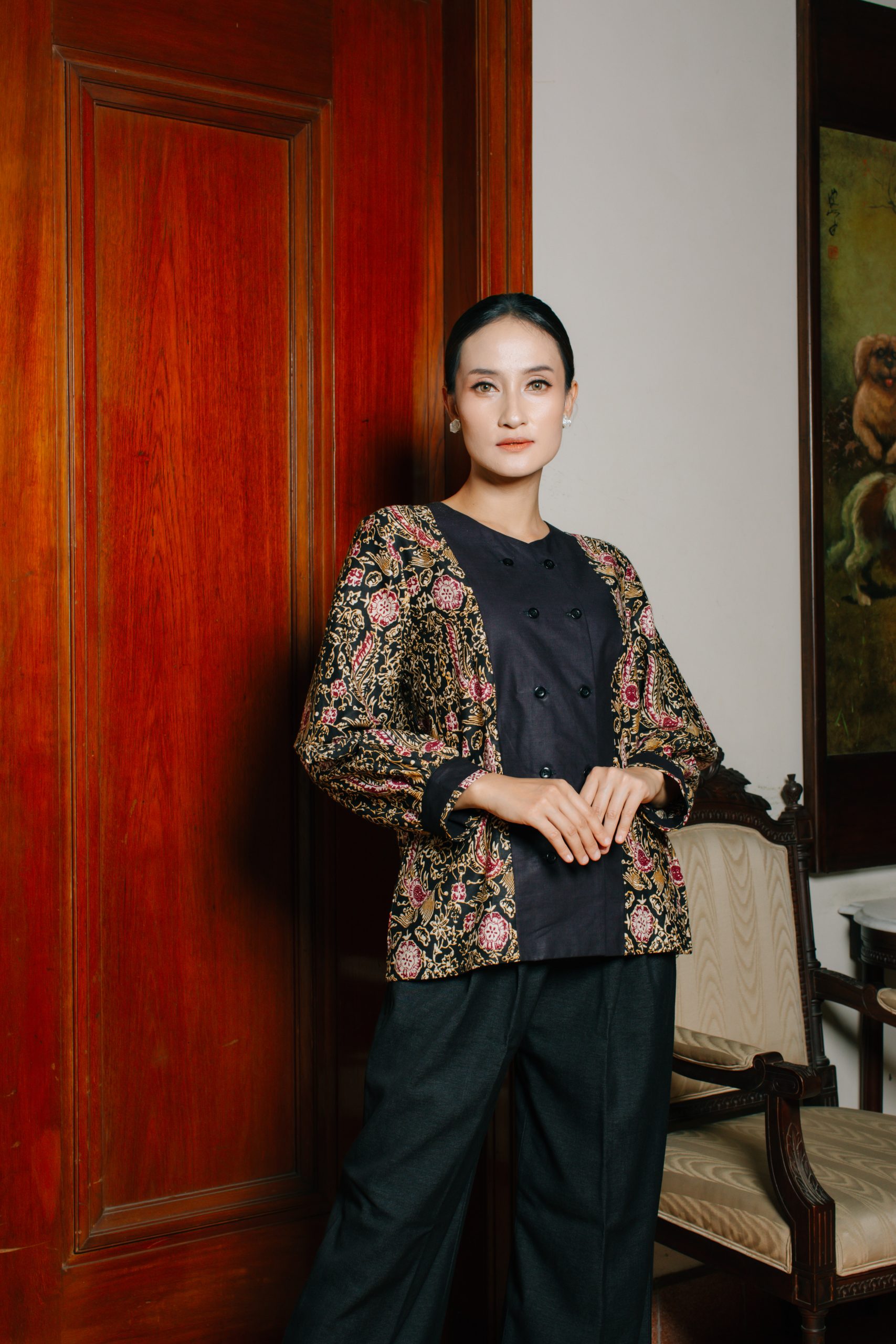 - Blouse Batik Double Breasted (Puspita 2092): Atasan batik wanita ini mengusung konsep double breasted dengan kombinasi warna hitam elegan dan motif floral klasik berkarakter. Desain ini memberikan kesan profesional, sophisticated, dan eksklusif sehingga cocok digunakan sebagai batik kerja wanita maupun outfit formal untuk acara resmi.